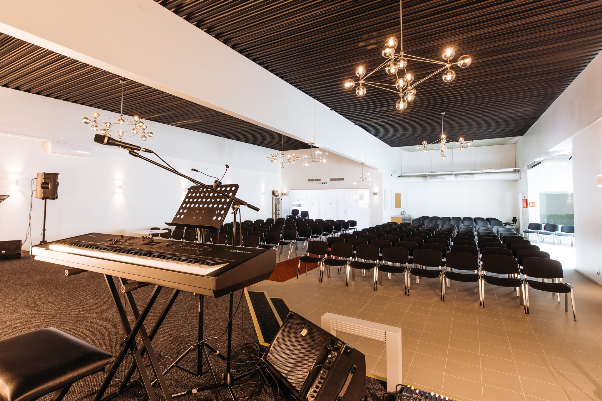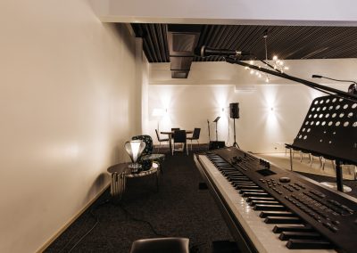 200 – 230 istumapaikkaa. Esiintymislava äänentoistolaitteilla. Sähköpiano.
